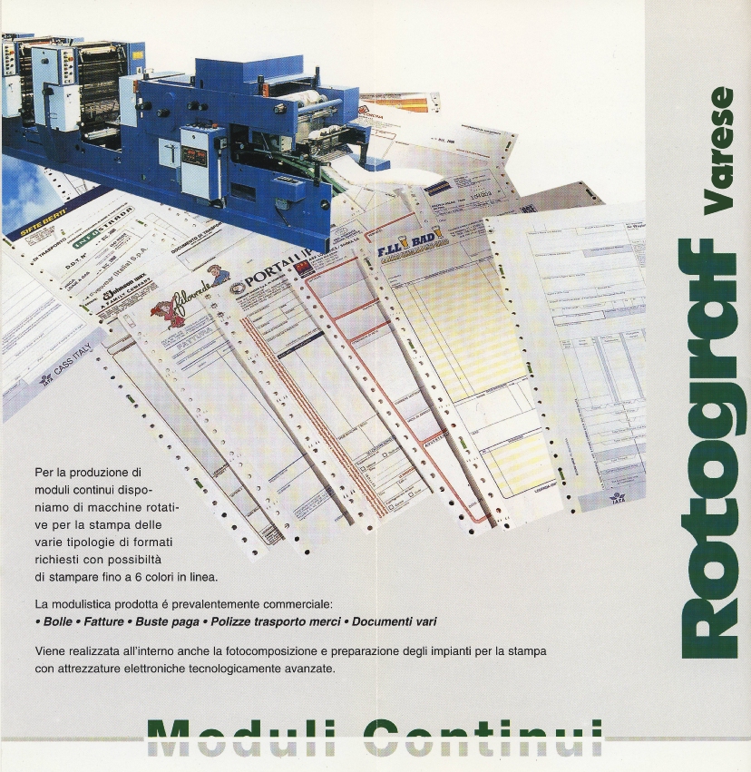 Qualsiasi produzione di stampa in continuo, snap out e modulistica sciolta con grande precisione e qualità. La nostra produzione è prevalentemente di modulistica commerciale e fiscale, per la quale disponiamo di autorizzazione ministeriale, quali bolle, fatture, buste paghe, polizze trasporto merci, bolle doganali, e documenti vari, personalizzati a richiesta, numerazioni, dati variabili, colla, desensibilizzazione ecc.